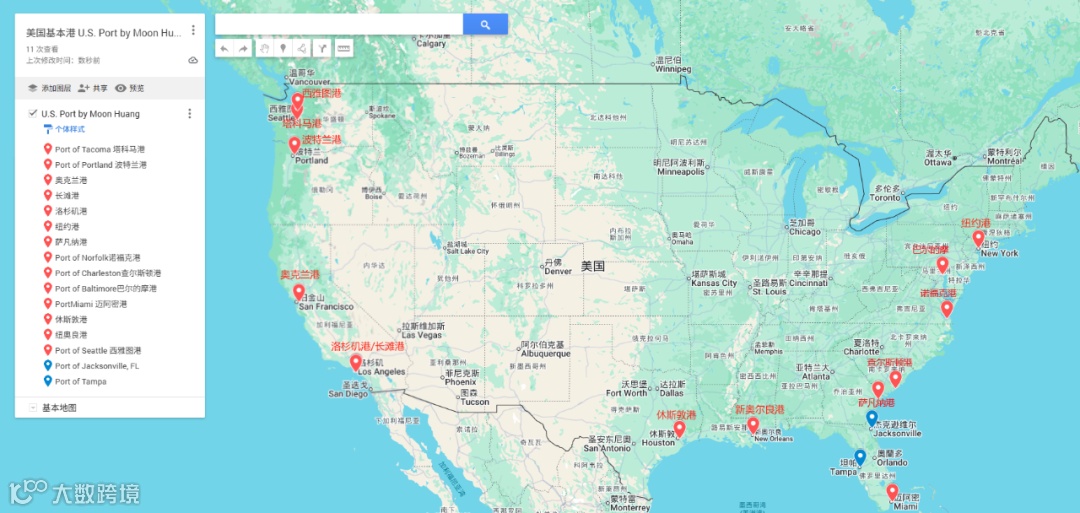 昨天的内容中国到美国海运基本指南 | Practical Guide to Shipping from China to the U.S.有提到过,按海运航线将美国分为美西、美东和美湾。下图红色标记的就是美国的基本港。