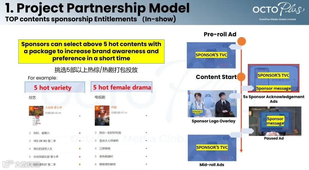 项目合作模式基于内容和定制所产生的定制型广告,广告主可选择5部以上的热门综艺节目或是电视剧,将广告内容插入在热门节目里推送给线上观众,短时间内提升品牌知名度。