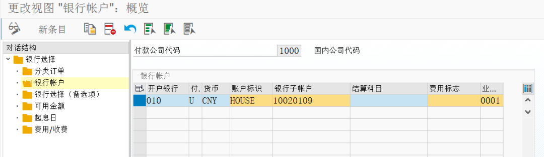 后台 财务会计(新)→应收帐目和应付帐目→业务交易→对外支付→自动对外支付→支付程序的付款方式/银行选择→设置支付事务的银行确定