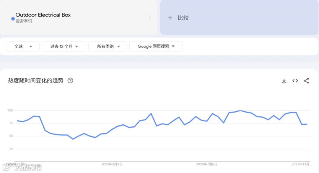 谷歌趋势数据显示,过去一年,“Outdoor Electrical Box(户外电器盒)”一词全球范围内搜索热度持续在44—100之间,从往年的42月份开始,搜索热度逐渐上到60+,爱尔兰、美国、英国、加拿大、新西兰等为主要关注者。