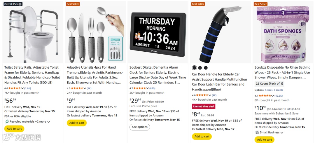 在亚马逊美国站,老年人用品种类多样,有辅助行走站立的产品、个护用品、智能警报用品、智力锻炼玩具等。