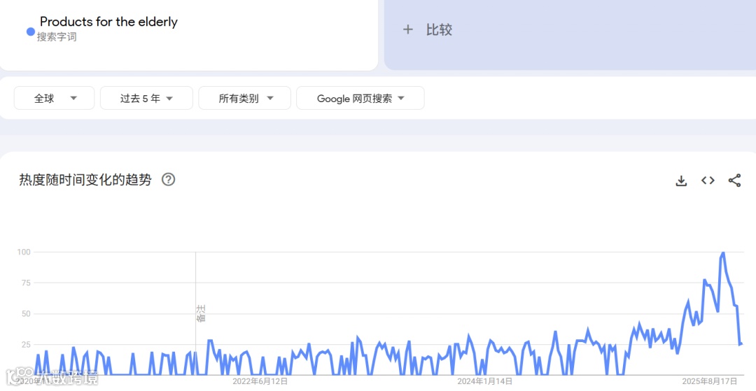 谷歌趋势数据显示,过去5年,全球范围内“ Products for the elderly”一词搜索热度不断,近一年内热度趋势上涨明显,越来越人开始关注老年群体及其产业。