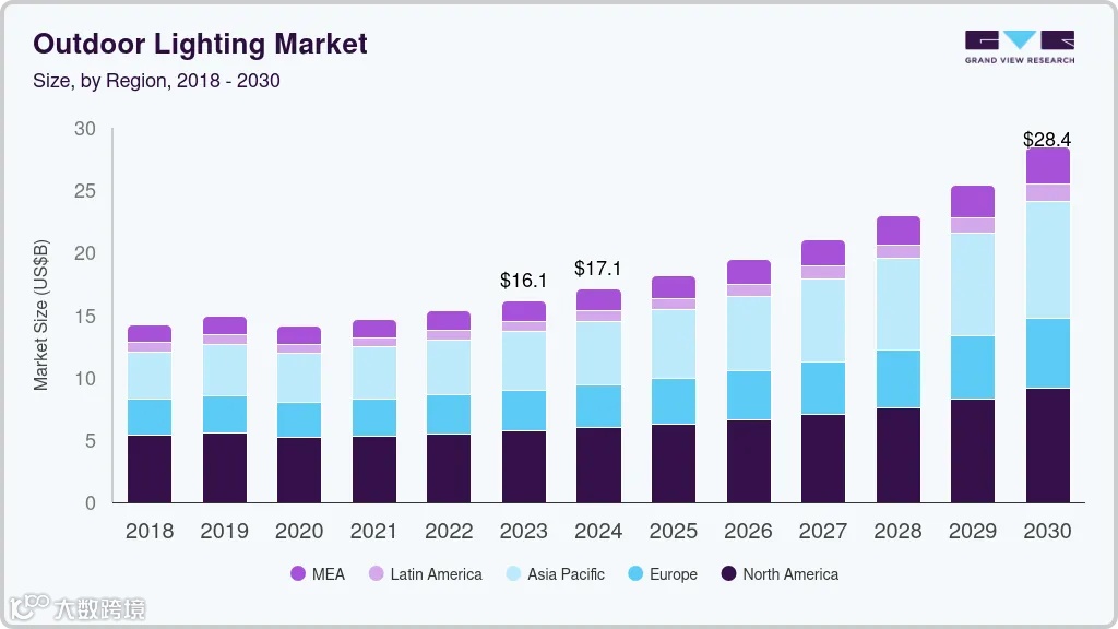 2024年全球户外照明市场规模估计为170.6亿美元,预计到2030年将达到284.3亿美元,2025年至2030年的复合年增长率为9.4%。全球对户外照明的需求正在显著增长,这主要得益于城市化、基础设施建设以及对节能解决方案日益增长的重视。