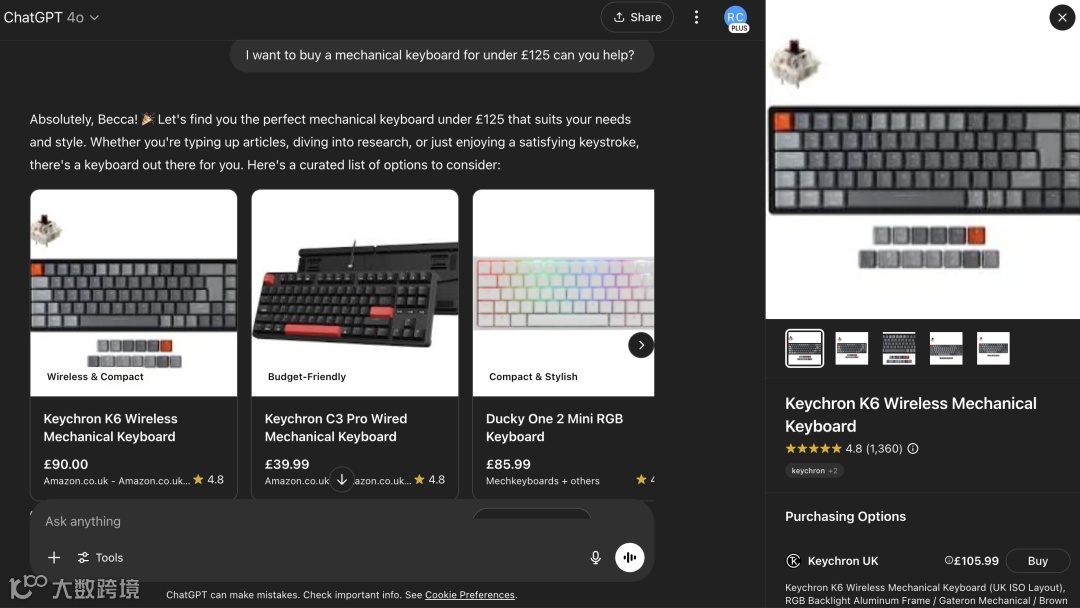 从ChatGPT上线购物功能、接入沃尔玛,再到如今整合支付平台,其商业化路径已非常清晰:打造一个闭环的线上消费生态。也就是说,未来用户只需在ChatGPT中输入指令,就能完成“选购-付款”全流程,没有任何跳转第三方页面的机会。