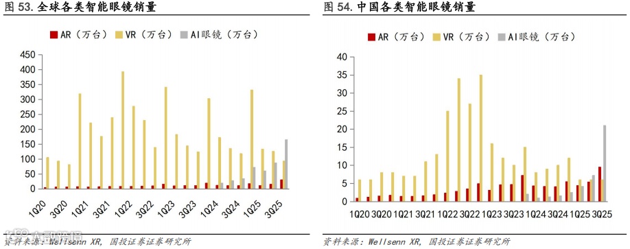 VR眼镜:3Q25全球VR眼镜销量为93万台,同比下降21%;中国VR眼镜销量为6万台,同比下降40%。销量下降主要系Quest 3/3S为主的产品销量乏力,产品内容升级较小,且各品牌VR营销投入存在被AI眼镜分流的情况。
