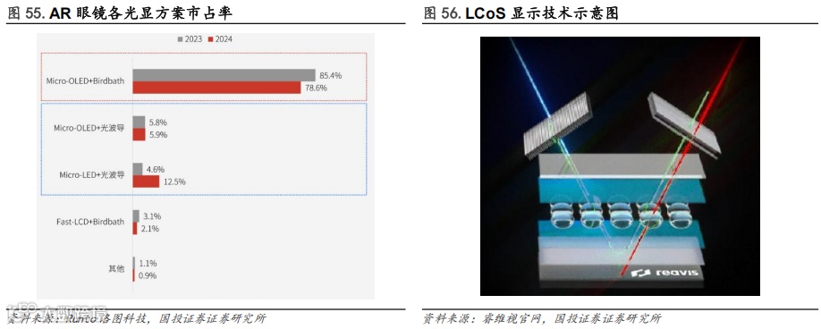 从技术角度来看,预计AR观影眼镜将持续占据市场主要份额,因此已经广泛使用的Birdbath+Micro OLED光显技术组合有望持续占据主要份额,但也需关注如LCoS、Micro LED技术的应用情况,如Meta在2025年9月发布的Meta Ray-Ban Display使用了LCoS显示搭配光波导光学方案,以实现兼顾性能与成本的全彩显示方案。