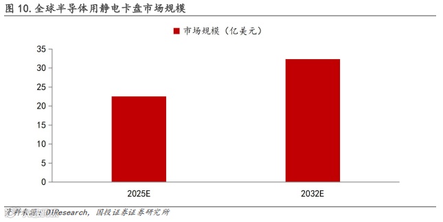 静电卡盘:静电卡盘市场有望持续受益于半导体设备需求的增加,据DIResearch数据,2025年全球半导体用静电卡盘市场规模将达到22.57亿美元,预计2032年达到32.33亿美元,2025-2032年CAGR+5.27%。