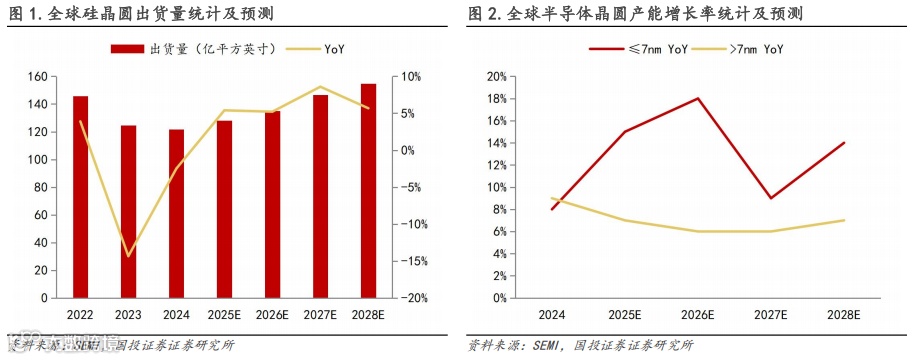 持续受益于AI相关强劲需求推动,全球硅晶圆出货量有望保持增长态势,据SEMI数据,2025年全球硅晶圆出货量预计达到128.24亿平方英寸,YoY+5.4%,且这一稳步增长趋势有望延续,到2028年预计实现出货量154.85亿平方英寸,2024-2028年CAGR+6.21%。全球晶圆产能预计到2028年将达到1110万片/月,2024-2028年CAGR+7%,其中主要推动因素系先进工艺产能(≤7nm)的持续扩张,预计将从2024年的每月85万片增长到2028年的140万片,CAGR+14%,约为行业平均水平的两倍。