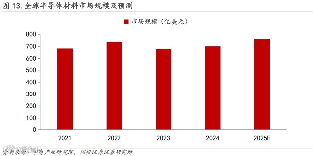 半导体材料是半导体产业链中细分领域最多的环节,其中制造材料包括硅片、光刻胶、电子气体等,封装材料包括封装基板、引线框架、键合丝等。近两年,随着整体半导体行业需求回暖,以及高性能计算、高宽带存储器等产品对光刻胶等先进材料的需求提升,全球半导体材料市场规模稳步提高。据中商产业研究院数据,2024年全球半导体材料市场规模为700.9亿美元,2025年将达到759.8亿美元。