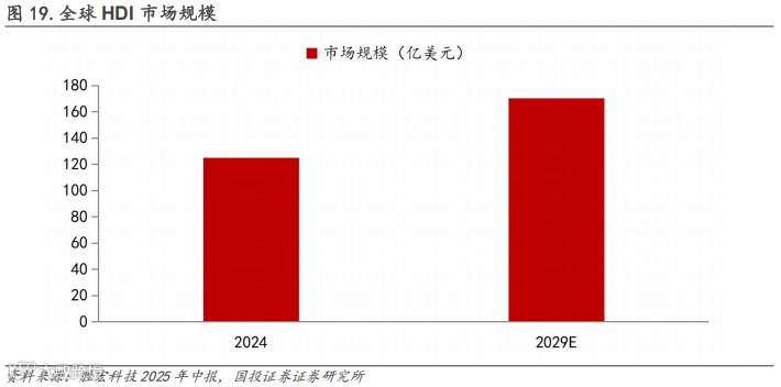 据胜宏科技2025年中报数据,受益于人工智能发展及AI算力提升,HDI等高端品需求快速增长,全球HDI市场规模预计在2029年达到170.37亿美元,2024-2029年年均复合增速将达到6.4%,其中,AI服务器相关HDI的年均复合增速预计将达到19.1%。