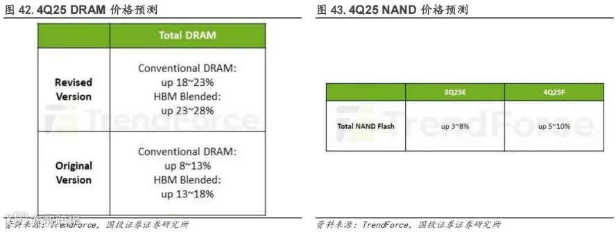 展望后续,存储价格有望进一步上涨。DRAM方面,4Q25 Server DRAM合约价有望受惠于全球云端供应商(CSP)扩充数据中心规模,涨势转强,带动整体DRAM价格上扬,据TrendForce预测,一般型DRAM价格预计涨幅18%-23%,纳入HBM,整体DRAM涨幅预计为23%-28%。NAND方面,HDD供给短缺与过长交期,使CSP将储存需求快速转向QLC Enterprise SSD,短期内急单大量涌入,造成市场明显波动。同时,SanDisk率先宣布调涨10%,Micron也暂停报价,使得供应端氛围由保守转为积极。在此外溢效应带动下,预估NAND Flash第四季各类产品合约价将全面上涨,平均涨幅达5-10%。