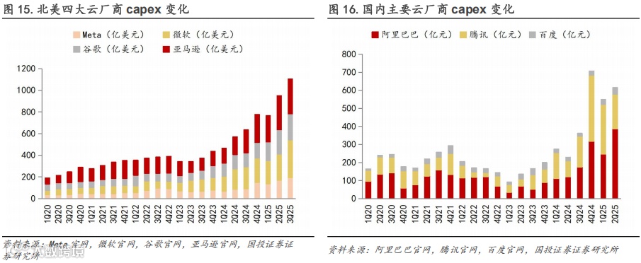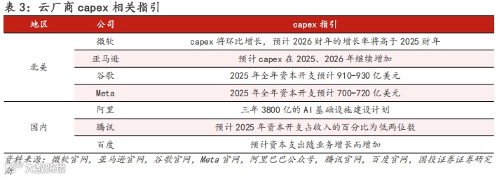 AI应用增长不断催生新的算力需求,各CSP持续加大投入,扩建AI相关基础设施,直接推高了各厂商的资本开支,3Q25谷歌将2025年全年资本开支指引上修至910-930亿美元,Meta则上修至700-720亿美元,CSP上修capex指引也体现出各厂商对AI驱动增长的乐观预期。