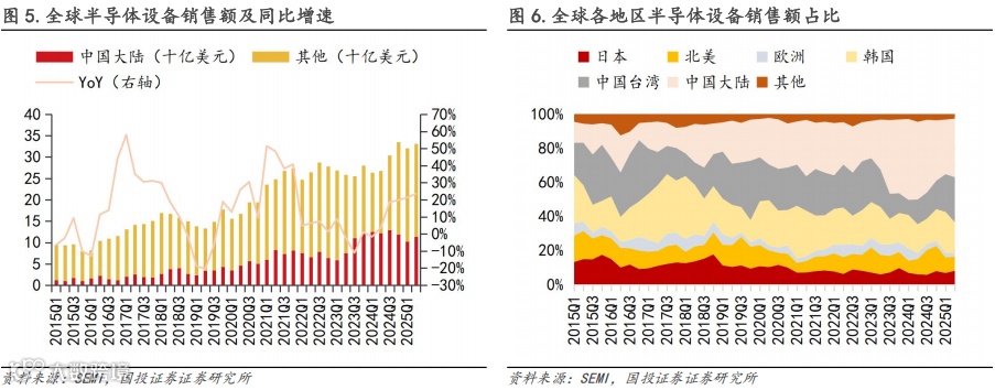 半导体设备在整个晶圆厂的成本拆分中占有较高份额,据SEMI数据,约占整个晶圆厂建设成本的70%-80%。25Q2全球半导体设备市场规模环比增加3.2%,同比增长23.5%,区域表现呈现显著分化,其中中国大陆市场环比+10.7%,同比-7.0%,主要系23Q2-24Q4本土晶圆厂建设高峰期推动设备采购处于高位导致25Q1出现环比回落,25Q2出现一定程度回升。其余各地区市场中,日本/北美/欧洲/韩国/中国台湾/其他地区设备销售额分别同比+66.5%/+15.0%/-24.5%/+30.8%/+124.9%/-27.5%,其中日本、韩国、中国台湾地区的同比高增主要系亚洲地区出货量增加的推动以及24Q2销售额较低带来的基数效应。