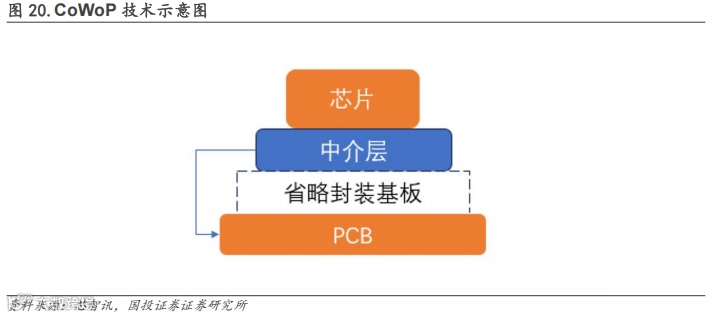 CoWoP:CoWoP代表Chip-on-Wafer-on-PCB技术路径,在完成芯片-晶圆中介层制造步骤后,中介层(顶部带芯片)直接安装到PCB(也称为平台PCB)上,而不是像CoWoS工艺那样绑定到ABF基板上。该技术的优势包括:简化系统结构进而通过减少传输损耗提高数据传输效率;更好的热管理性能和更低的功耗;降低每代产品都在上升的基板成本;潜在减少一些后端测试步骤。