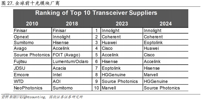 中国光模块企业在全球市场格局中占据重要地位,据据Lightcounting数据,2024年全球光模块前10企业中有7名是中国厂商。