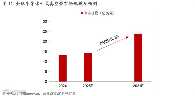真空泵:干式真空泵是半导体零部件中的关键组件之一,预计随着半导体设备需求不断增加,以及对半导体制造工艺要求的提升,真空泵市场规模有望迎来持续增长。据QYResearch数据,2024年全球干式真空泵市场规模约13.3亿美元,预计2025年将达到14.36亿美元,2031年将进一步增加至23.84亿美元,2025-2031年CAGR+8.8%。