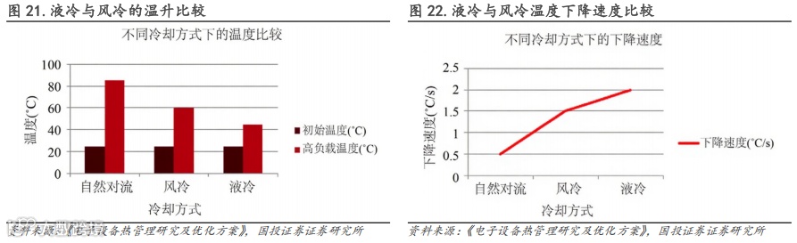 在冷却方面,随着设备性能的提升,尤其在高集成度、高功率密度场景下,风冷的散热效率已无法解决散热问题。而液冷技术利用液体的高热容和高热导率,相较于风冷方案大大提高了散热效率,如单相流体散热能力大约能到10-1000W/cm2量级。