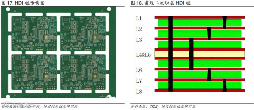 HDI:HDI板具有更密集的布线和更小孔径,具有提高信号完整性、降低电磁干扰、缩小尺寸和重量等优点。HDI板可以分为不同的阶数和层数,阶数表示每个层面上有多少次激光钻孔或微细加工,层数表示有多少个层面叠加在一起,一般来说,阶数越高,层数越多,HDI板的密度和复杂度就越高。目前先进的GPU加速卡需要使用5阶20层或以上的HDI板。