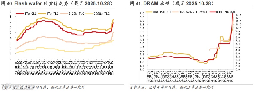 此轮涨价的主线主要为企业级存储,AI服务器催生大量存储需求。闪迪、美光、长存自25年4月1日起纷纷启动涨价,Flash Wafer现货价自25年4月以来涨幅明显,据全球半导体观察数据,截至2025.10.28,1Tb QLC/1Tb TLC/512Gb TLC/256Gb TLC自4月以来分别涨价36%/32%/67%/75%。DRAM方面,由于AI服务器的DRAM需求高涨,涨价更为明显,截至2025.10.28,DDR4 16Gb eTT/DDR5 16Gb eTT/DDR4 16Gb 3200自4月以来分别涨价220%/116%/567%。