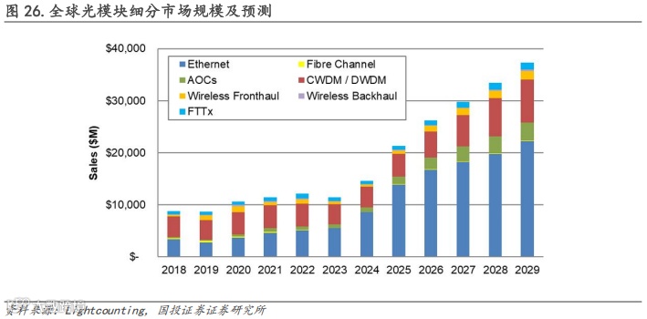 受AI集群应用对以太网光收发器的强劲需求,以及云服务厂商对其密集波分复用(DWDM)网络的升级等推动,光模块市场有望迎来持续性增长。据Lightcounting预测,光模块的全球市场规模 2024-2029年或将以22%的CAGR保持增长,2029年有望突破370亿美元。