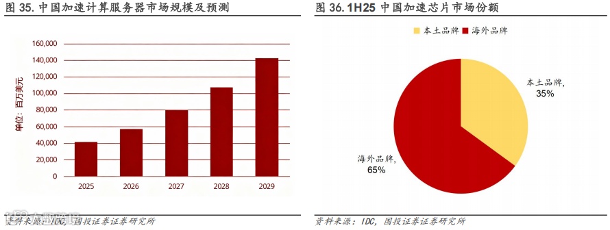 AI浪潮下,中国加速计算服务器市场同样呈现出明显增长态势,据IDC数据,1H25中国加速服务器市场规模已达到160亿美元,同比增长一倍以上,预计到2029年市场规模将达到1400亿美元。整体规模增长的大趋势下,地缘政治、供应链安全等因素不断催化国产化加速,国产替代势在必行,1H25中国加速芯片中本土品牌市场份额占比约35%,且有望在未来持续提高。