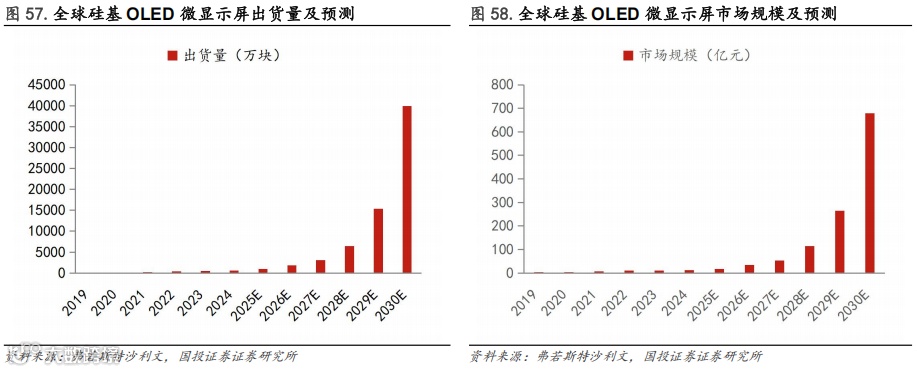 因此,预计Micro OLED仍会是后续AR显示方案的主要增量方向之一。据弗若斯特沙利文报告,全球Micro OLED显示屏出货量2024年为636.5万块,2030年预计出货量为39956.6万块,2024年至2030年均复合增长率达到99.36%;2024年全球Micro OLED显示屏销售额已达到12.7亿元人民币,预计将以94.11%的年复合增长率在2030年达到679.3亿元人民币。