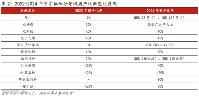 在半导体材料需求增多的前提下,叠加美国封锁限制,促使半导体材料国产化率持续加速,据观研天下数据,硅片2022年国产化率仅为9%,2024年8英寸硅片国产化率已提升至55%;电子气体国产化率由2022年的不足5%提升至2024年的15%。