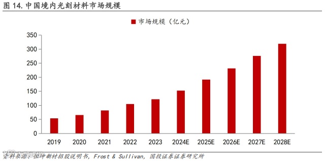其中,如光刻胶、空白掩模版等具有技术壁垒较高、国产化率仍较低的特点,是国产替代潜力更为深厚的领域。在供应链安全战略驱动下,下游晶圆厂为保障生产安全与成本可控,有望推动国产材料需求进一步增加,市场规模增长确定性较强。据弗若斯特沙利文数据,2023年境内光刻材料整体市场规模为121.9亿元,将于2028年增长至319.2亿元,2023-2028年CAGR+21.23%。