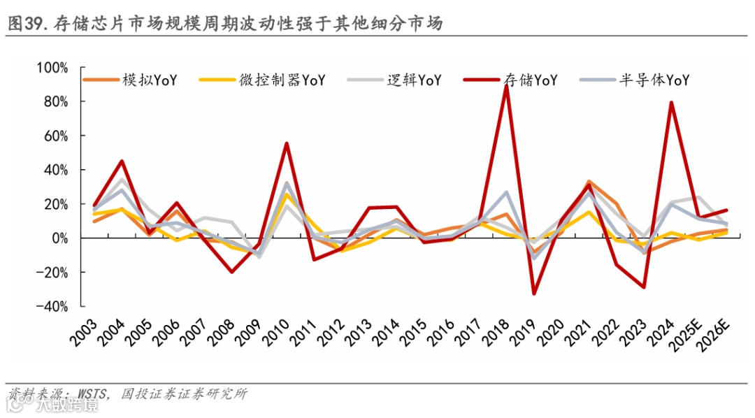 此外,存储的行业周期波动大于其他半导体细分市场,弹性更强。主要原因为存储芯片市场标准化程度最高,可替代性强,受行业景气度供需关系影响较大,且当前存储行业已形成垄断格局,头部厂商在产能规划和产品定价方面步调相对一致。