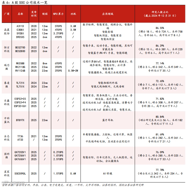 而SoC作为AI终端的计算核心,正系统性地推动板块步入“业绩与估值双击”的新阶段。技术层面,国产SoC已实现6nm先进制程突破与0.2-6TOPS算力跨度,全面覆盖智能家居、汽车、穿戴等AI终端场景。