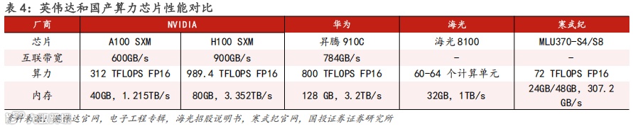 目前,海外芯片公司如英伟达等仍占据算力芯片市场较大份额,其中英伟达为绝对领先地位,具有技术领先优势,形成了一定的技术壁垒。我国如华为、海光、寒武纪等公司纷纷推出算力芯片产品,在技术不断优化、政策推动等共同因素作用下,国产芯片有望加速扩大市场份额。