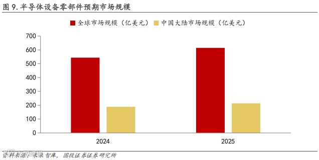 据未来智库数据,2024年全球半导体零部件市场预期规模为542亿美元,2025年预计达到613亿美元,其中,中国大陆半导体设备零部件市场2024/2025年市场规模预计分别为187/211亿美元。