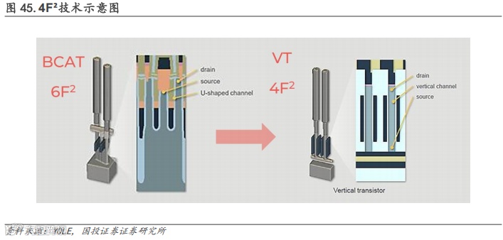 4F²技术是实现3D DRAM的一个重要技术方向,将存储阵列和外围电路阵列从水平放置变为垂直放置,单元长边和短边都是2F,单元面积因此为4F²,相较于之前的8F²、6F²技术有效减少了存储单元面积。