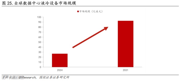 未来随着数据中心服务器功率不断攀升,液冷有望持续提升在数据中心市场的市场规模,据QYResearch,2024年全球数据中心液冷设备市场规模约为26.57亿美元,预计2031年将达到92.31亿美元,2025-2031年CAGR+19.8%。
