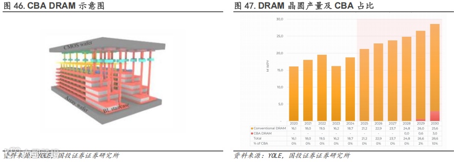 而CBA技术指将外围电路阵列和存储阵列晶圆分开制造,再用Hybrid Bonding混合键合方法键合。因此,具有两大优势:一是提高良率和品质,外围电路不受高温高压影响;二是可使用更先进纳米制程生产逻辑外围电路阵列。据YOLE数据,DRAM制造商预计CBA和4F²的结合将使比特密度提高约30%。