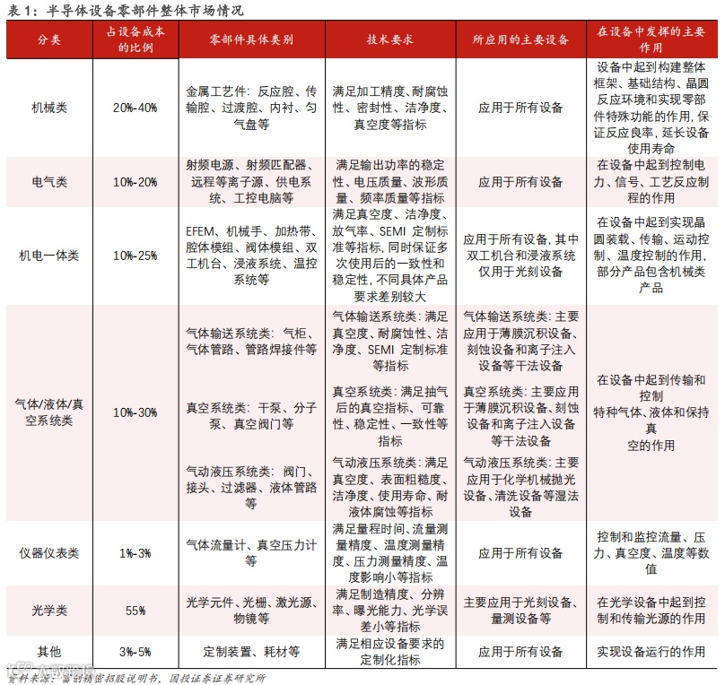 半导体设备精密零部件是半导体设备的重要支撑,不仅是半导体设备制造环节中难度较大、技术含量较高的环节之一,也是国内半导体设备企业“卡脖子”的环节之一。据富创精密招股说明书披露,在半导体设备的成本构成中,精密零部件的价值占比较高,一般占设备成本构成的90%以上,其中机械类、机电一体类、气液真空类及光学类市场占比较大。