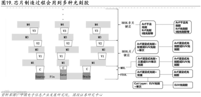 ①前道工艺关键层鳍式(Fin)和栅(Gate)采用氟化氩(ArF)浸没式(波长193nm)双重投影光刻技术实现,对应使用ArF浸没式光刻胶;