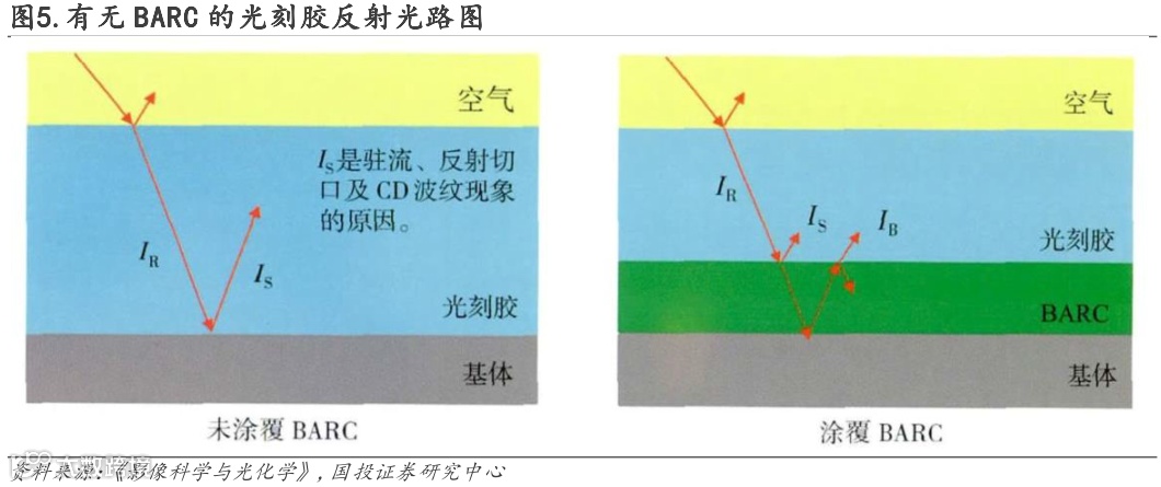 抗反射涂层能够提升关键尺寸的均一性,BARC是目前主流方案。随着集成电路制程提升,图案分辨率要求提升,相对应的光刻技术的曝光波长不断减小,也伴随着负面的光刻工艺中驻波效应、摆动效应和凹缺效应等对图案关键尺寸的均一性影响增加,进而严重影响图案的清晰度和分辨率。抗反射涂层作为配套光刻胶,可以有效缓解这一问题。大部分的光刻胶是多层结构,在涂覆光刻胶前,可先将抗反射涂层涂覆在晶圆表面,作为光刻胶的其中一种涂层,以减少底部光的反射。抗反射涂层(Anti-Reflective Coatings,ARC)可分为顶部抗反射涂层(Top Anti-reflective Coatings,TARC)和底部抗反射涂层(Bottom Anti-reflective Coatings,BARC)两种,BARC降低摆动效应和凹缺效应的效果更明显,因此增加BARC是目前行业普遍采用的主流方法。