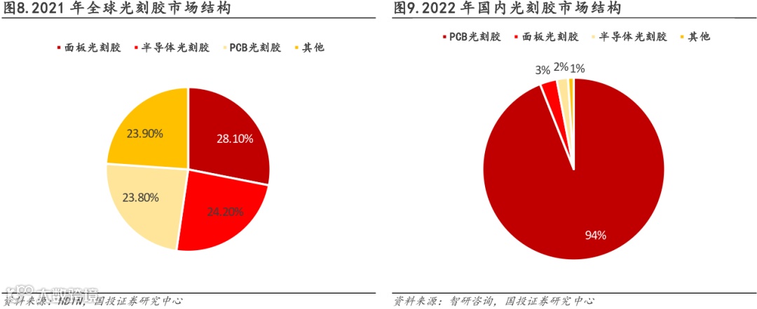 全球市场前三大应用占比合计超75%,国内市场中PCB光刻胶仍占主流。全球光刻胶市场的面板胶、半导体胶、PCB市场份额较为均衡,根据HDIN的数据,2021年占比分别为28.10%、24.20%、23.80%。我国光刻胶行业起步较晚,2022年国内光刻胶市场PCB光刻胶占比达94%,面板光刻胶占比3%、半导体光刻胶占比2%。面板光刻胶、半导体光刻胶等部分高端产品仍需依靠进口,自给率较低,发展相对不均衡。