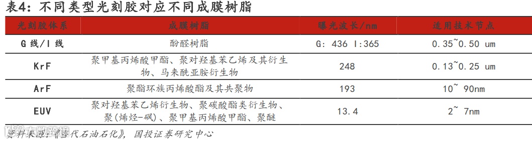 类似地,KrF光刻胶树脂在ArF的193nm曝光光源下具有较高的吸收性,也无法达到ArF光刻胶树脂的要求条件,不同曝光波长对应的光刻胶品类之间,树脂也需一一对应,难以通用。
