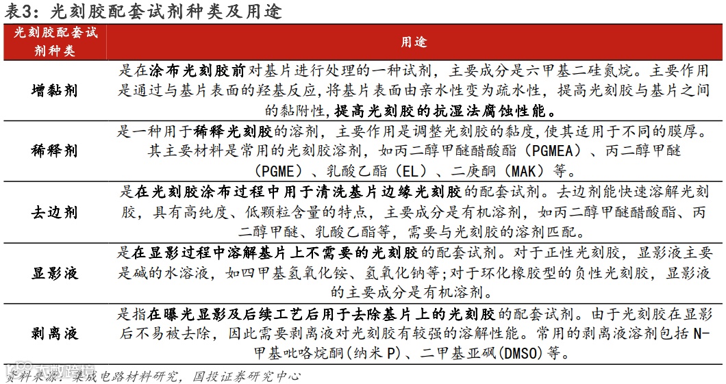 光刻胶配套试剂是光刻工艺中与光刻胶配套使用的湿化学品,主要包括增黏剂、稀释剂、去边剂、显影液、剥离液等。大部分配套试剂的组分是有机溶剂和微量添加剂,溶剂和添加剂都是具有低金属离子及颗粒含量的高纯试剂。在光刻工艺过程中,稀释剂用于稀释光刻胶,增黏剂用于涂布环节前,去边剂用于涂布环节中,显影液和剥离液用于显影环节及后续。