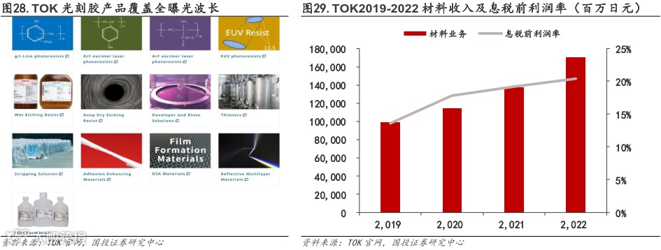 TOK(东京应化):全球半导体光刻胶龙头。TOK具有世界领先的微细加工和高纯化技术。1968年,TOK开始开发和销售第一批日本制造的半导体光刻胶。如今,TOK提供与所有光刻机兼容的全系列光刻胶。除光刻胶外,TOK产品覆盖半导体制造领域、半导体封装领域、图像传感器/MEMS制造领域、面板制造领域等。根据TOK官网公布的数据,TOK2022年全球半导体光刻胶市场市占率第一,达26.1%,细分市场中:g线/i线光刻胶市场市占率为22.8%、KrF光刻胶市场市占率为36.6%、ArF光刻胶市场市占率为16.2%、EUV光刻胶市场市占率为38.0%。TOK材料业务(含光刻胶)连续四年正增长,2022年实现收入1703亿日元,息税前利润率20.4%。
