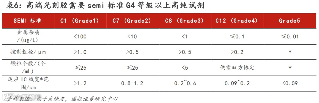 超净高纯试剂国产化率低,国内精细化工水平与海外差距较大。合成光刻胶过程中,需要丙二醇甲醚醋酸酯、乳酸乙酯等高纯试剂。目前国际上公认的湿电子化学品杂质含量标准是SEMI国际标准,共分为五个等级。集成电路制造对于材料品质有较高要求,g/i线光刻胶需要G1至G3 SEMI等级的超净高纯试剂,KrF光刻胶需要G3至G4 SEMI等级的超净高纯试剂,ArF光刻胶则需要G4 SEMI等级以上的超净高纯试剂。中国大陆大多数企业湿电子化学品产品等级在SEMI G1至G2,部分企业在单一产品上达到SEMI G3级别,只有极少数企业个别产品达到SEMI G4以上级别,与世界领先水平还有较大差距。根据亚化咨询2022年公布数据,湿电子化学品的高端产品国产化率仅10%左右。
