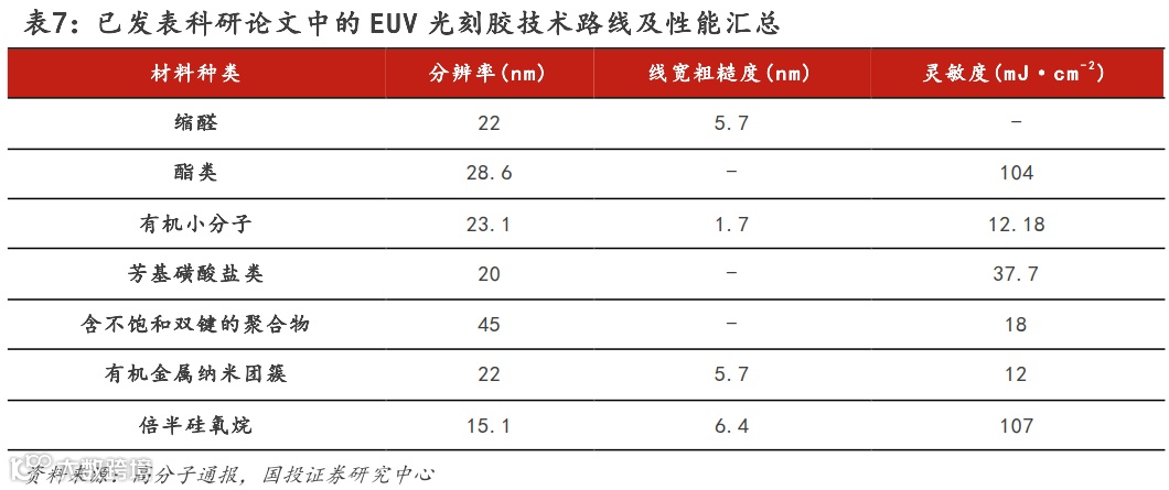 EUV光刻胶的研发可以追溯至1994年,在2000年之后逐步成熟:2002年,东芝开发出分辨率达到22nm的低分子EUV光刻胶。东京应化(TOK)与信越化学都参与到了SEMATECH的EUV光刻胶的开发工作,其中JSR在2011年与SEMATECH联合开发出用于15nm工艺的化学放大型EUV光刻胶。