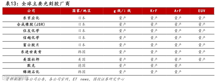日系龙头厂商技术领先,已实现高端光刻胶量产。目前,东京应化、JSR、信越化学、住友化学、富士胶片、韩国东进、美国杜邦已覆盖所有不同曝光波长的半导体光刻胶类型。