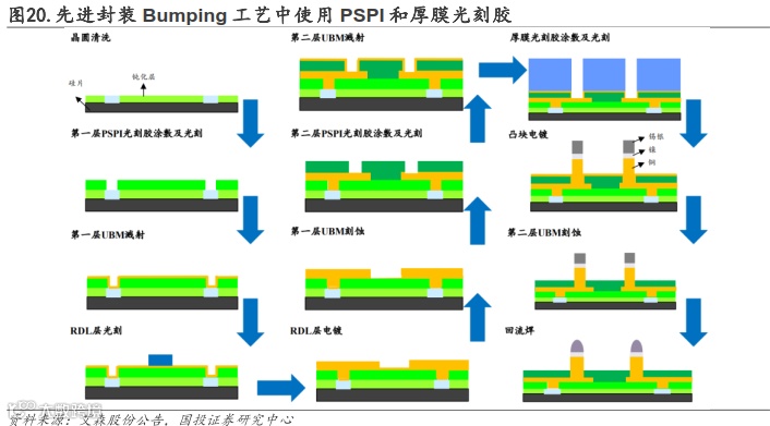 先进封装g/i线光刻胶、PSPI光刻胶用于Bumping、RDL、TSV等先进封装工艺环节。与IC制造时使用的g/i线光刻胶相比,大多数封装技术中所用到的光刻胶层要厚很多,一方面是由于先进封装对精度要求相对晶圆制造环节低,另一方面是由于凸块需要厚涂。根据中国电子材料行业协会的数据,2022年中国集成电路g/i线光刻胶市场规模总计9.14亿元,预计2025年将增长至10.09亿元;其中集成电路封装用g/i线光刻胶市场规模5.47亿元,预计2025年将增长至5.95亿元。先进封装g/i线正性光刻胶可用于先进封装Bumping工艺中图形转移、线路重排(RDL)、TSV技术;先进封装g/i线负性光刻胶用于先进封装Bumping工艺中。凸块制作封装光刻胶PSPI是一种光敏性聚酰亚胺材料,兼具光刻胶的图案化和树脂薄膜的应力缓冲、介电层等功能,类似于有图案的介电薄膜,可用于Bumping和RDL等先进封装工艺流程中。根据中国电子材料行业协会数据,2021年中国集成电路晶圆制造用PSPI 市场规模7.12亿元,预计到2025年将增长至9.67 亿元。