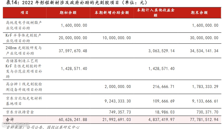 政府补助及大基金支持,助力行业产业化升级。以彤程新材为例,2022年公司光刻胶项目涉及政府补助包括:高纯度电子级树脂产业化项目、KrF半导体光刻胶产业化项目、248nm光刻胶研发与产业化项目、存储器制造工艺用KrF负性光刻胶的开发与示范应用项目、高分辨Ⅰ线光刻胶检测设备升级项目、京东方北旭光电材料基地项目等。新增补助金额2199万元,光刻胶项目政府补助期末余额为7778万元。另外,大基金二期曾于2021年和2023年先后增资南大光电和晶瑞电材子公司:向宁波南大光电增资1.8亿元;向增资晶瑞电材子公司湖北晶瑞增资1.6亿元。