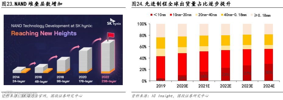 (3)先进制程出货占比提升:根据IC Insight数据,10nm以下先进制程芯片出货比重逐年提升,2019年10nm以下先进制程芯片出货占比为4%,预计2024年将增长至30%。