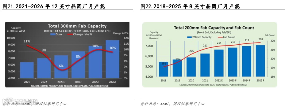 全球晶圆厂产能稳步扩充,国内晶圆产能比重进一步提升。根据SEMI预测,全球半导体制造商2026年将推升12寸晶圆厂产能至每月960万片(wpm)的历史新高。12寸晶圆产能经2021-2022年连续扩充后,2023年因存储、逻辑芯片需求疲软,扩张速度将有所趋缓。囿于美国出口管制,中国大陆将集中于成熟技术发展,并在政府支持下,带领12寸晶圆厂产能扩张,预估全球产能比重将从2022年的22%增至2026年的25%,达每月240万片。根据SEMI预测,2021年到2025年,全球半导体制造商8寸晶圆厂产能有望增加20%,至每月711万片(wpm)。2025年中国的8英寸晶圆产能增速将达66%,领先全球其他地区,且产能占比持续增加,约占全球8寸晶圆总产能21%,约每月149万片。