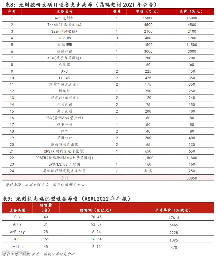 壁垒二:前期研发投入高昂,高端光刻机设备进口受限。光刻胶研发费用高,设备支出投入巨大。光刻胶厂商需要购买光刻机用于内部配方测试,根据验证结果调整配方。根据2021年晶瑞电材公告,单一台ArF光刻机需支出1.5亿元,设备总支出为3.4亿元。根据国际光刻机巨头ASML公告,2022年ASML公司单台EUV光刻机平均售价在1.76亿欧元,ArFi浸没式光刻机平均售价在0.65亿欧元。另一方面,高端光刻机依赖进口,影响产品研发进度。自2019年12月瓦森纳协议修订以来,美国、日本等成员国对我国半导体出口一般按照N-2原则审批,即比最先进的技术晚两代。根据半导体产业纵横的数据,光刻机国外厂商的交期是3~5年,不确定性增加。国内进口高端光刻机受限,阻碍了和光刻机相配套光刻胶的研发突破。